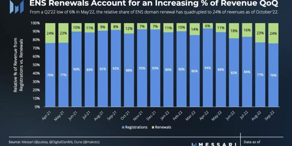 评估ENS收入时值得考虑的另一个方面是注册和续订的类型。注册和续订3-4个字符的ENS名称的成本大大高于注册5个以上字符的ENS名称。截至2022年9月,注册ENS域名的平均成本可分为三层:332美元、92美元和7美元。同样,截至2022年9月,续订ENS域名的平均成本为:191美元、66美元和6美元。在22年第二季度,人们争先恐后地铸造3和4个字符名称和短词。随着这些类型的ENS名称数量的减少,创造昂贵名称的机会也减少了。由于可以注册这些昂贵的名称,相对于5个以上的字符名称,3和4个字符名称的注册收入份额在22年第三季度显著下降。鉴于价格层级的这些差异,来自5个以上字符名称的注册和续订的美元收入仍环比增长8%。定性分析