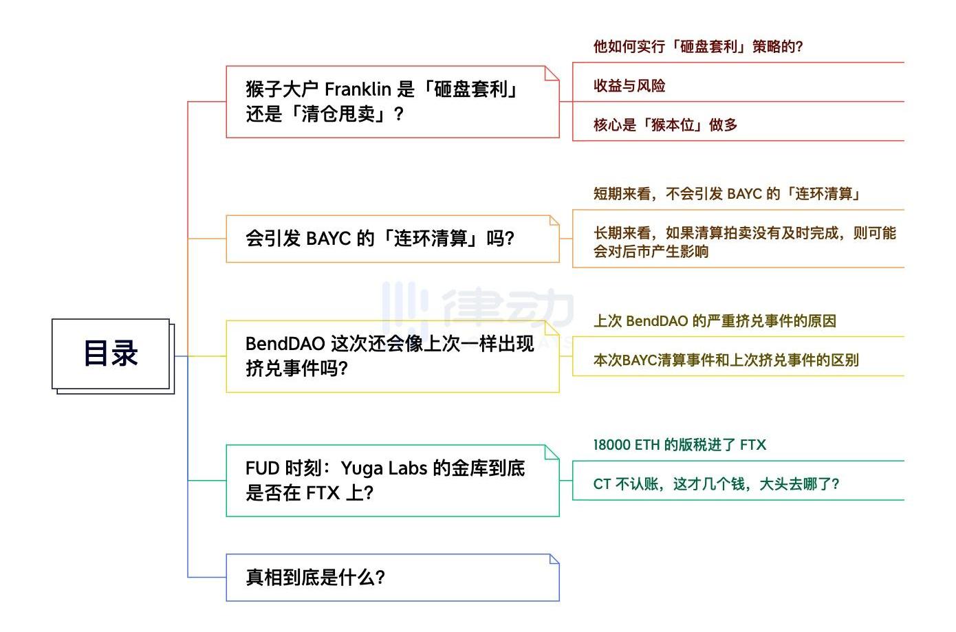 正在BendDAO中清算拍卖的BAYC们由于地板价的下跌,导致了NFT借贷平台BendDAO中抵押的BAYC直接触发清算拍卖程序,还有大量BAYC处于触发清算拍卖的边缘。这时发现了有人「操控」地板价来引发BendDAO触发拍卖清算,更令人意外的是,这个幕后的「大空头」是BAYC的第7大持仓者Franklin。时值FTX崩盘,聊聊这起「砸盘套利」事件和YugaLabs背后的FUD和真相。目录