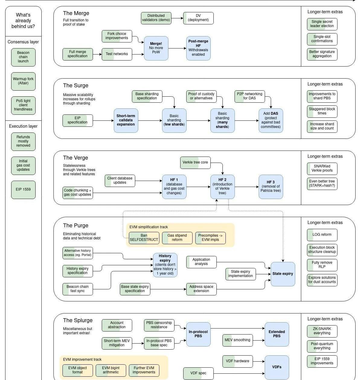 上表中,FRI是Starkware采用的多项式承诺方案,可以实现量子级别的安全,但证明的数据量却是最大;IPA是Bulletproof和Halo2零知识算法默认的多项式承诺方案,验证时间相对较长,采用的项目有门罗币,zcash等,前两者是不需要初始可信设置的。由上图可以看出在证明大小与验证时间上,KZG多项式承诺的优势比较大,KZG承诺也是目前应用最广的一种多项式承诺方式。但KZG是基于椭圆曲线,配对函数,需要初始可信设置的。ETH升级路线与多项式承诺的关联