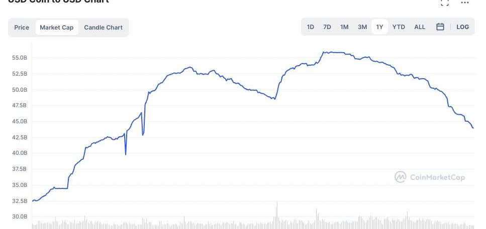 USDC市值从2月17日的525.5亿美元,下降至11月9日的427.4亿美元,下跌了18.7%,幅度小于加密货币总市值的下跌。