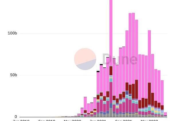 该指标衡量了存入以太坊上DeFi协议的资产的价值这一下降可归因于加密货币价格的下跌,因为DeFiTVL中的大部分资产是由价格下跌的波动性资产组成的,例如ETH和wBTC。下降也可能是由于链上收益率下降,对于资本的吸引力降低,导致流动性外流。现货DEX交易量下降了31.6%,从2816.8亿美元降至1927.3亿美元