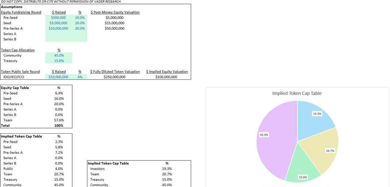 我们建立了一个模型,根据上面列出的假设计算token分配比例表。表格标绿的部分表示假设的融资情况,创始人和投资者可根据真实情况进行融资金额填写,以获得一系列隐含的token比例分配数值。点击下载该模型。点击这里观看视频。为什么确保token比例与股权比例匹配很重要?任何分配不当都可能令团队、投资人和社区失望。创始人和投资者应该有一个如何正确分配token的框架和模型。该模型模板旨在成为未来token分配比例的标准框架。固定token供应比例分配不同于股权比例分配。每当团队进行融资时,就会凭空产生新股,从而稀释现有股东股份。另一方面,每当团队融资时,不会凭空产生新的token——token是从其协议的有限储备中给出的。三、在股权持有的token上累积价值