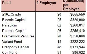 1.ElectricCapital的人均员工管理费最高VC也可以被视为“初创企业”,这在这些数字中得到了反映。例如,a16z的每位员工管理费可能是最高的,但我们还没有考虑这些费用中有多少流向了可能不直接参与a16z加密基金运营的公司高管和创始人。这些细节不为公众所知,可能会影响我们对这些数字的理解。除a16z外,这里的其他基金都是加密原生基金,因此更容易以准确的方式消化这些数字。ElectricCapital的每位员工管理费最高,而FabricVentures最低。