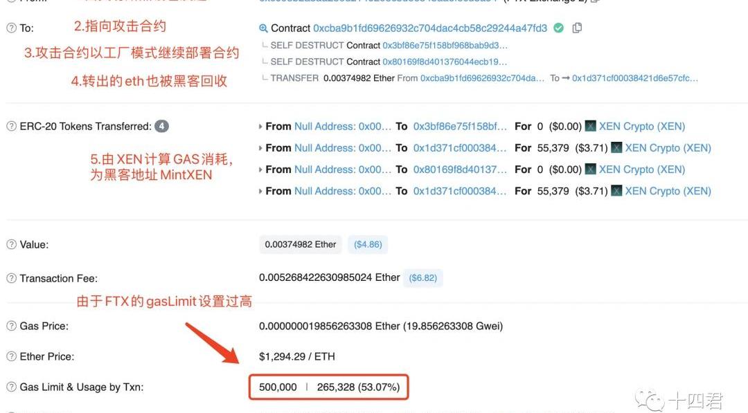 其实mirror上爆出的还不是最大的攻击者,而此攻击手法最早出现在10-10号,截止10-15号,合计类似逻辑的攻击地址有38个,合计1.45W笔攻击。计算依据:FTX热钱包单笔转移gas消耗大于5W,且to地址是合约地址的交易。下图为其中top10的攻击者,其交易数占总攻击数的80%,致使FTX手续费损失86个ETH笔者通过对其交易的gas消耗总值核算后,得出FTX本次损失总值为:108.19个ETH合计铸造出XEN约24亿个。按14号日常价格估算的话,则黑客总收益在24W美金以上