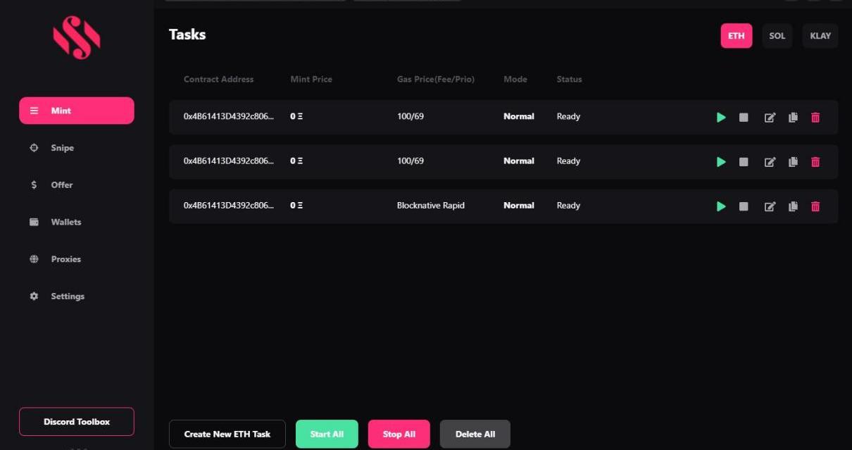 1、Metasniper链接:https://metasniper.app/Metasniper是一款NFT桌面端Bot,支持钱包批量导入、生成、管理。支持合约监听铸造、自定义条件单购买、支持代币分发或归集,提供一键上架;允许ETH、SOL、KLAY多链使用。