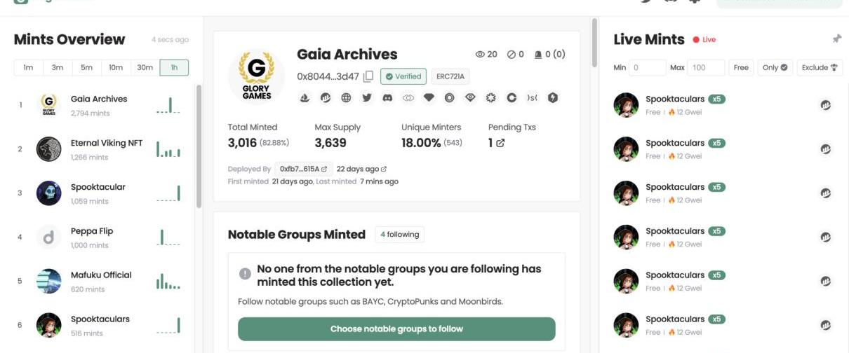 5、Nftnerds链接:https://nftnerds.ai/Nftnerds主打NFT交易,不过同样提供了铸造监控功能,监控面板左边显示实时铸造信息,包括每一笔铸造的GAS、小费、铸造价格、铸造数量;右侧面板会根据项目方铸造数量进行排序,同步显示Pending信息、知名钱包铸造数量、铸造趋势图信息。