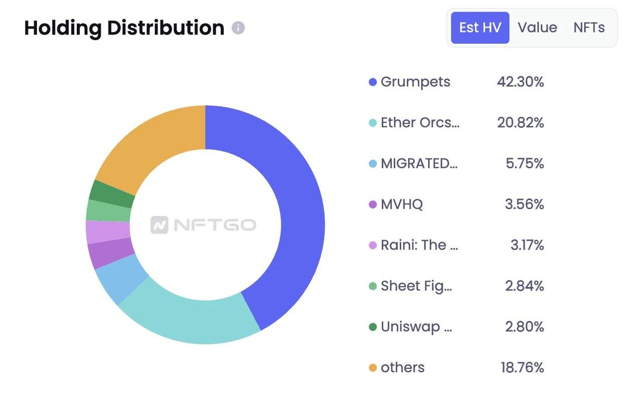 Twitter:@GriffdenNFTAddress:0x2ea4815f47d685ed317e8bd243b89bcb26b369faFlipTimes:1956FlipsRatio:52%HoldingValue:90ETHNFTs:2114PnL:456ETHNFTGoProfile:https://nftgo.io/account/ETH/0x2ea4815f47d685ed317e8bd243b89bcb26b369fa/NFT在该地址持有的所有NFT中,EstHoldingValue最多的是SappySeals,占据了12.61%。除此之外,Griffden还持有较多ArtBlocks以及Acrocalypse。其中Acrocalypse不仅是一个PFP收藏品,也是paperhands.gg的生态系统NFT,拥有该NFT可以执行整个Acrocalypsegalaxy的任务。