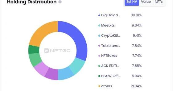 Twitter:@kdimes00Address:0x616ed054e0e0fdbfcad3fa2f42daed3d7d4ee448FlipTimes:1054FlipsRatio:55%HoldingValue:25ETHNFTs:323PnL:1.35kETHNFTGoProfile:https://nftgo.io/account/ETH/0x616ed054e0e0fdbfcad3fa2f42daed3d7d4ee448/NFT该地址所持有的现估价值最多的NFT是DigiDaigaku,占据了该地址所持有总数的30.81%。其次,位居第二的是Meebits。值得注意的是,在目前的集合中,TablelandRigs是@kdimes00买入价值最高的项目,占据28.34%,没有卖出,收益为负。