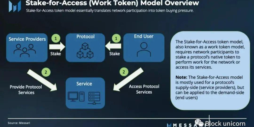 Stake-for-Access模型,也称为工作代币模型,要求服务提供商质押原生代币,以便为网络执行工作。质押的代币可以作为抵押品,也可以惩罚节点的恶意参与者。以Graph为例,该协议要求供应端参与者(Indexers和Curators)持有本地令牌(GRT),以便能够为网络提供索引和查询处理服务。GRT投资越多,服务提供商获得的奖励就越多。通常,代币质押的数量与服务提供商可以执行的工作量成正比。这种关系创建了一种动态,其中服务提供商根据他们持有的代币金额赚取收入(以本地代币形式)。因此,使用SFA模型时,代币价格应随网络使用情况而增加。MulticoinCapital的管理合伙人KyleSamani雄辩的解释了其中的博弈论:“随着服务需求的增长,更多的收入将流向服务提供商。考虑到代币的固定供应量,服务提供商将合理地支付更多的每一个代币,以获得增长的现金流的一部分的权利。”虽然SFA模型通常只适用于供应方的参与者,但它也可以用于协议的需求方。口袋网络不仅要求服务提供者入股以进行工作,而且还要求访问协议的RPC服务。这种需求方的方法捕获了更多的价值,但它是以牺牲终端用户的体验为代价。最后的想法