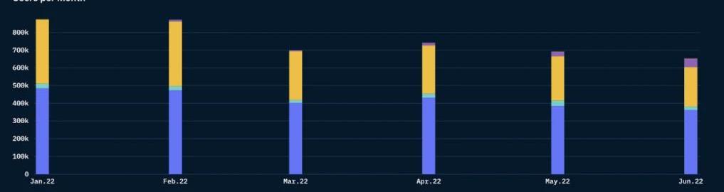 NFTGodMode-MeebitsTransactions在2022年第二季度末,ChromieSquiggleNFT的估计地板价约为8.5ETH,交易量稳定,SmartNFT买家的买入量很大。6月21日,处理了50笔ChromieSquiggleNFT交易,涉及41位独立买家。