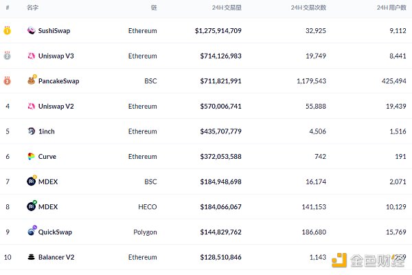过去24小时去中心化交易所的交易量数据来源:Debank