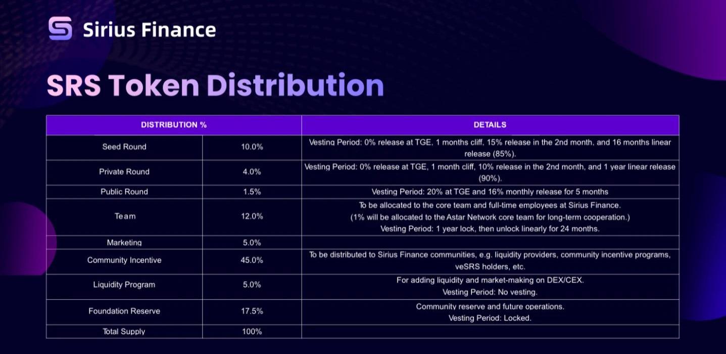 随着SRS代币进入流通,SiriusFinance已针对其流动性池启动了代币激励活动,依照0.036美元/SRS的公售价格计算,当前各大池子的挖矿收益相当可观,4Pool年化收益高达400%+,ASTR/nASTR和其他非稳定币池的年化收益也都有100%+。预计在如此幅度的激励措施下,SiriusFinance的TVL在接下来的一段时间内将迎来一轮较快速的增长。如果说在DEX功能层面的创新优化是SiriusFinance的内功修养,那么连接至其他生态的跨链能力就是SiriusFinance向外扩展的武功秘籍,这也是该项目区别于普通DeFi项目的核心要点所在。具体来说,SiriusFinance的跨链能力将依赖于Polkadot的跨链消息传递格式XCM。此前,Astar已在其网络上激活了XCM转账功能,但目前受限于技术开发进程,可用场景暂时仍然较少。理想情况下,如果XCM未来能够顺利全面落地,整个Polkadot生态之内的平行链将实现无缝的跨链交互可能性,届时SiriusFinance将可立足于Astar,无缝连接至Moonbeam、Clover、Gear等其他同构平行链,继而再通过一些异构跨链组件连接至以太坊、Solana、Avalanche、Cosmos等其他外部生态,将其服务扩展至整个Crypto世界。不过话说回来,将跨链功能寄予XCM之上的选择反过来也意味着,如果不向其他生态扩展,SiriusFinance的前景会在很大程度上与Astar和Polkadot高度绑定,客观来说这也构成了该项目未来发展状况的一个未知因素。代币档案:SRS