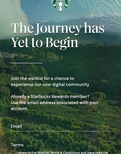目前星巴克官方已提示“奥德赛”Web3旅程尚未正式开始,加入候补名单有机会体验星巴克的全新数字社区,但需要登记与星享俱乐部关联的电子邮件地址,并勾选同意候补名单条款和条件并已阅读星巴克隐私声明。如果不是星享俱乐部会员,则需要先进行注册。