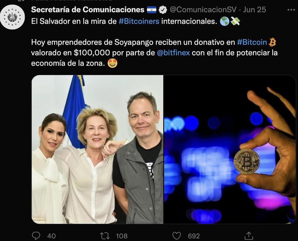 图片来源:@PaoloArdoinoBitfinex和Tether对萨尔瓦多的捐助一直没有结束,6月25日,萨尔瓦多官方宣布Soyapango的企业家们收到了来自Bitfinex的价值10万美元的比特币捐赠。捐赠目的是促进该地区的经济发展。