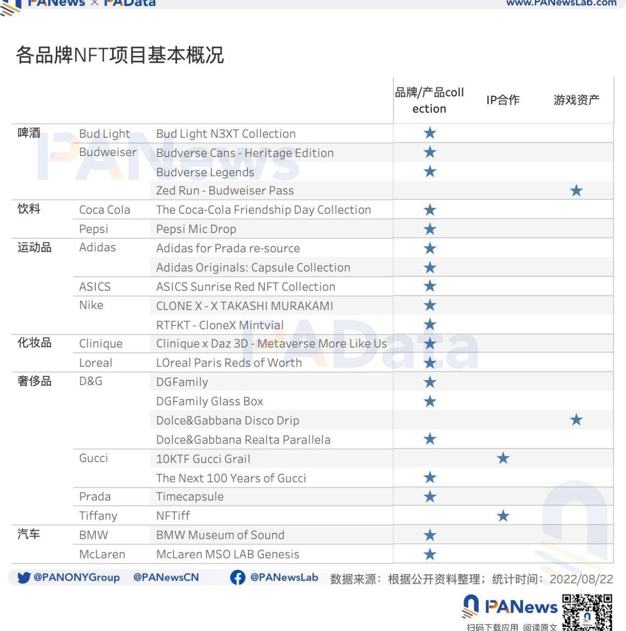 PAData根据公开资料统计了15个品牌共计23个NFT项目的发行情况,这些品牌中发行NFT项目最多的是Dolce&Gabbana,共发行了包括DGFamily在内的4个项目,其次是Budweiser,发行了包括BudverseCansHeritageEdition在内的3个项目。另外,Adidas、Nike、Gucci都发行了2个项目。从这些NFT项目的形式来看,23个项目中有19个项目都是以自有品牌或产品的收藏品形式发行,即主要用NFT的形式来配合品牌宣传或新产品上线,比如Pepsi、CocaCola、Dolce&Gabbana、Prada、Gucci等。在其他品牌NFT中,Gucci的10KTFGucciGrail和Tiffany的NFTiff采取和加密行业原生大IP合作的形式发行,前者的合作IP涵盖了BoredApeYacheClub、MutantApeYacheClub、0N1、Kennel、CoolCats等,后者的合作IP是CryptoPunks。另外值得关注的是Budweiser的ZedRun-BudweiserPass和Dolce&Gabbana的DiscoDrip都以游戏资产的形式发行,前者是ZedRun中的通行证,后者是元宇宙Decentraland中可穿戴设备的访问凭证。