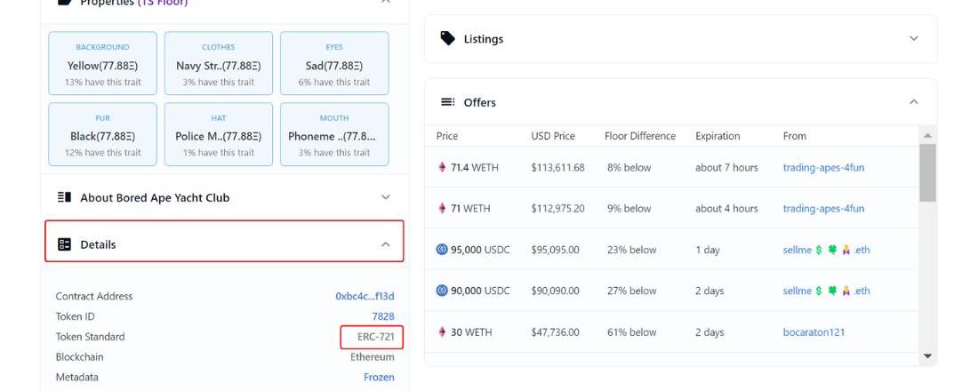 5.在同个页面,向下滚动查询该NFT的详细信息检查“TokenStandard”,大多数头像类NFT都是ERC-721代币。
