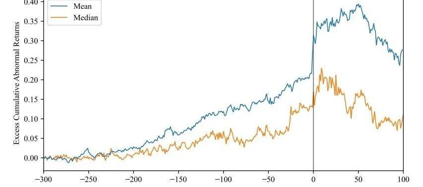 假设所列公告列表中存在内幕交易,那么将发生在加密货币在DEX上币前。DEX无需了解您的客户(KYC)或反(AML)要求,并为个人提供匿名和不受限制的伪交易机会。尽管没有直接的KYC或AML要求,但DEX是完全透明的,所有交易都在区块链上公开可用。我们将该组中的代币标记为可能的内幕交易组,以便我们可以将其特征与不太可能参与内幕交易的代币进行比较;该组包含98个列表。我们收集了在上币公告前300小时至公告后100小时代币上币的价格变动数据,以监测任何可能成为内幕交易潜在证据的异常交易模式。图1显示了LTIG组的累积异常回报的平均值和中位值。目测来看,在上币公告前250小时开始存在明显的上涨趋势,并一直持续到正式上币公告时。由于新信息进入市场且交易员会对此作出反应,公告前还会有大幅上涨。我们观察到的上涨趋势与被起诉的股票市场内幕交易案件的上涨趋势一致。
