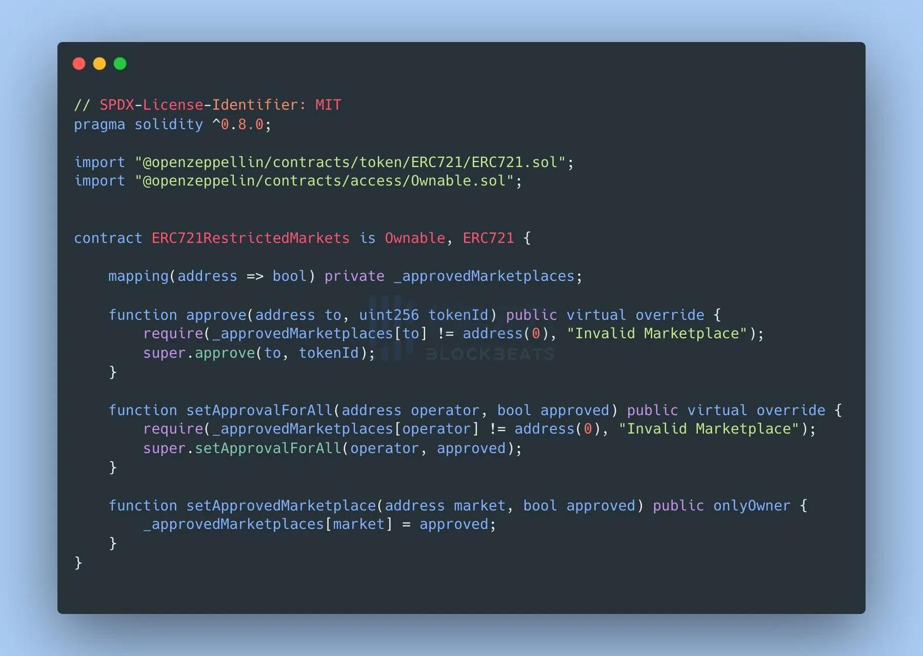 建立可交易NFT市场白名单Azuki的官方团队开发人员cygaar发布推文表示:可以更改NFT智能合约,建立可交易的NFT市场白名单,或者说,直接禁止其NFT集合在那些支持零版税的NFT交易市场上挂单交易。2.推出自己的NFT交易市场