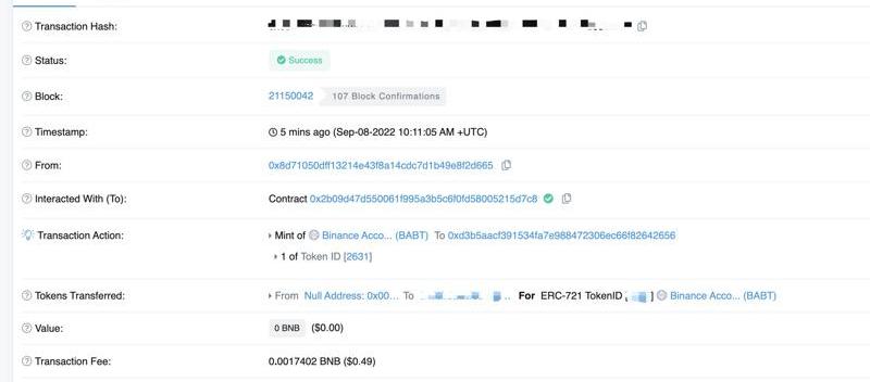 我们可以看到,钱包中已经收到了一个名为“BABT”的ERC-721代币了。截至本文发布时,BABT已成功铸造3056枚。