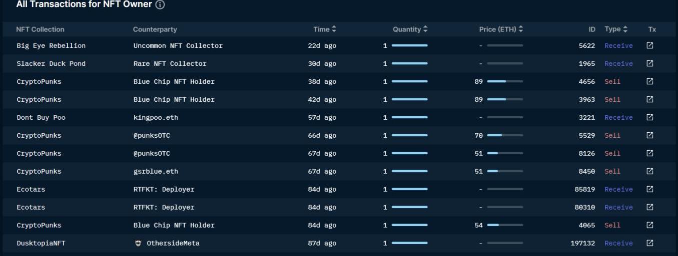 以下是使用WalletProfilerDashboard调查的一些最赚钱的鲸鱼-moin3au.eth。Moin3au.eth是按利润排名最赚钱的NFT钱包地址,他们的大部分收益都是通过著名的加密朋克CrpytoPunksNFT来交易的,将500ETH变成了1500ETH。该地址购买了356件藏品,迄今为止已售出其总藏品的60%。MeebitsNFT是moin3au.eth的另一个高利润集合,Nansen的WalletProfiler对这个钱包的活动进行了全面的细分。显示moin3au.eth决定获利的NFT以及钱包中的NFT收藏品,该仪表板允许投资者复制最佳操作。
