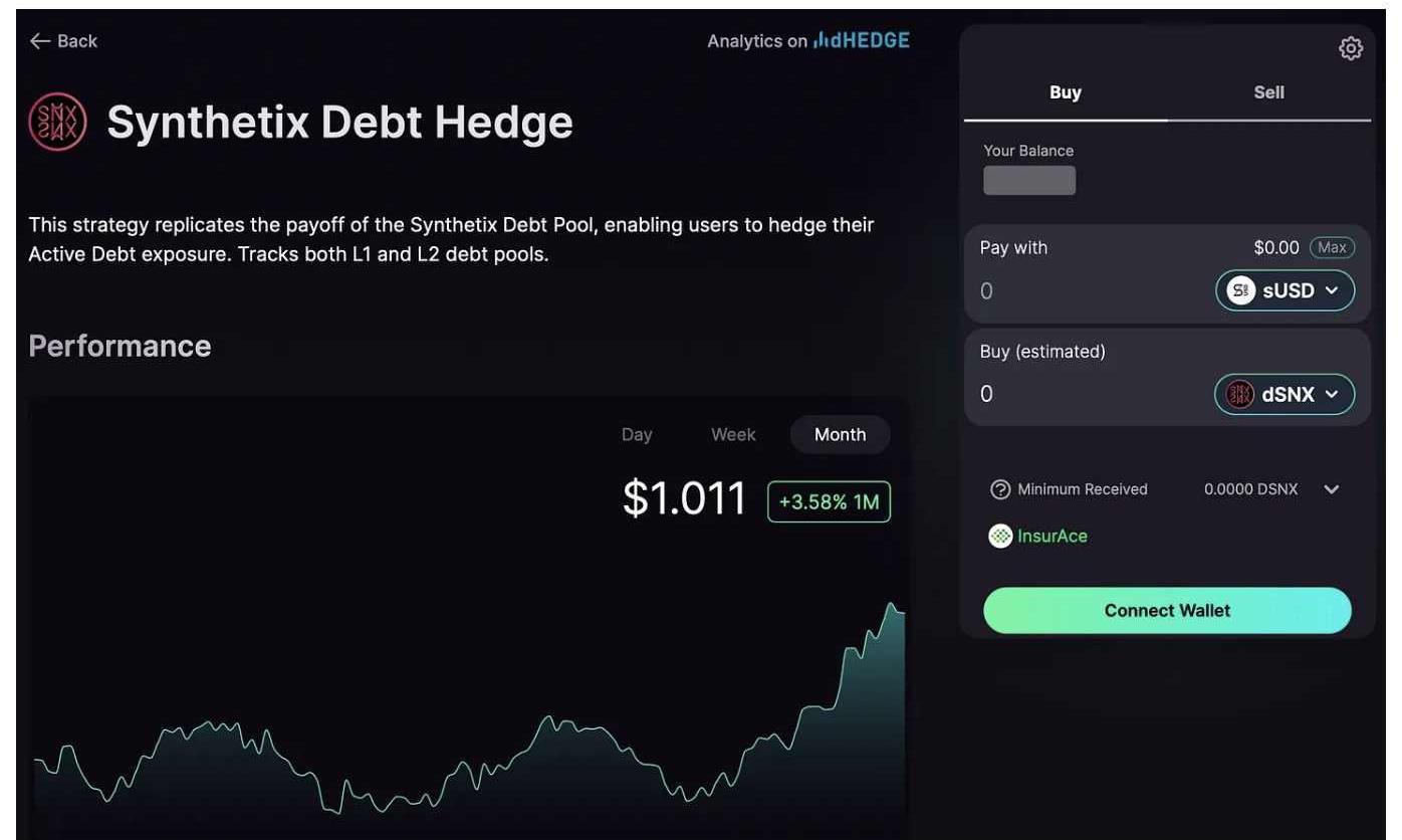 sUSD债务众所周知,为了参与SNX质押,你需要质押你的SNX和铸造sUSD。一旦你成为SNX质押者,你就身处于Synthetix的全球债务池。实际上,对于SNX质押者而言,他们是任何持有Synthetix提供的合成资产头寸的交易者的对手方。这意味着你的债务头寸会发生波动,如果交易者赚钱了你的债务就会增加,交易者亏钱了你的债务就会减少。Synthetix的最初想法是,交易者平均而言往往会亏损,因此Synthetix将实现盈利。因此,当你的债务金额随着交易者的开仓和平仓而变化时,你就完全暴露在市场波动之中。然而,现在有可能完全对冲你在OptimismL2上的债务头寸,这要感谢dHedge和他们分拆出来的Toros。Toros允许你用你铸造的sUSD购买dSNX,这样你就不会受到市场波动的影响,你的债务也不会随着时间推移而增加。