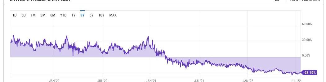 灰度归DCG所有,一段时间以来,DCG一直在购买该信托的股份。DCG在2021年3月至2022年1月期间购买了1500万股,然后在2022年2月至2022年3月期间又购买了约300万股。同样在此期间,GBTC价格从溢价变为折价: