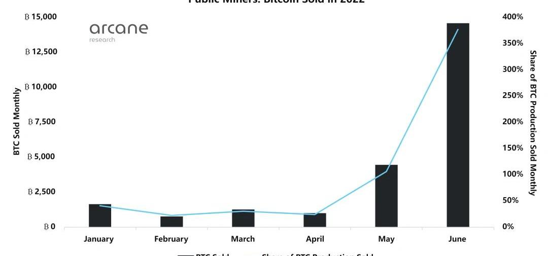 上图显示了上市矿企在2022年3月31日的比特币和矿机抵押债务状况。我们看到CoreScientific和Bitfarms是迄今为止拥有这些债务最多的公司,巧合的是他们也是这个熊市中最大的比特币卖家。我们还看到,Marathon、CleanSpark和Riot,没有卖出那么多比特币,在这个熊市开始之前,他们没有任何比特币或矿机抵押的债务。Bitfarms在6月份发布了一份新闻稿,解释了他们为什么卖出3,000枚比特币。该公司将所得款项用于偿还比特币和矿机抵押的债务。特别是他们与GalaxyDigital的比特币抵押信贷融资出现了问题,因为比特币价格下跌迫使他们出售比特币来偿还贷款。矿企会继续抛售吗?