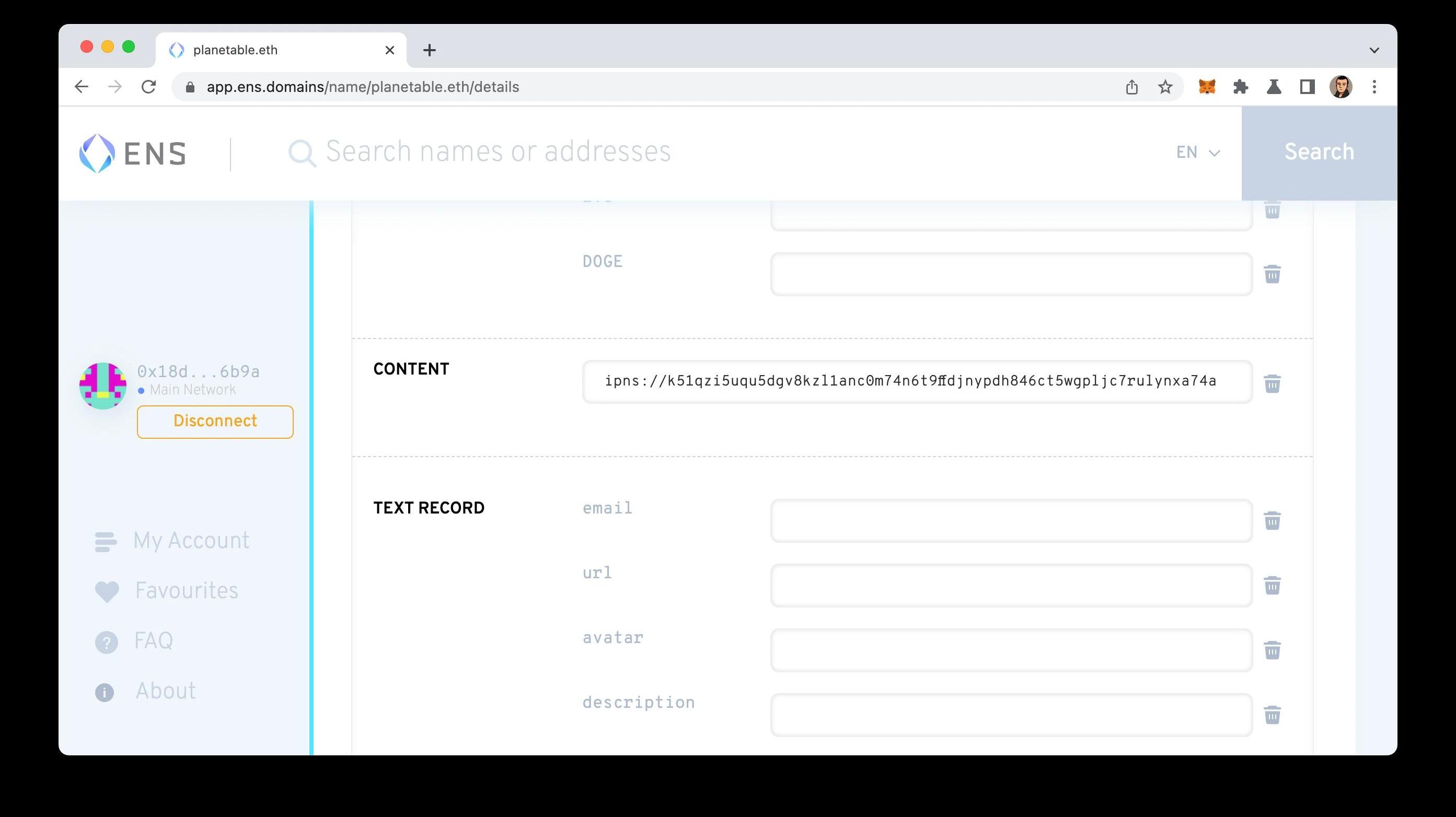 打开app.ens.domains,然后在Content处填入你刚才获得的IPNS,记得在前面加上协议ipns://,就像下面截图中这样: