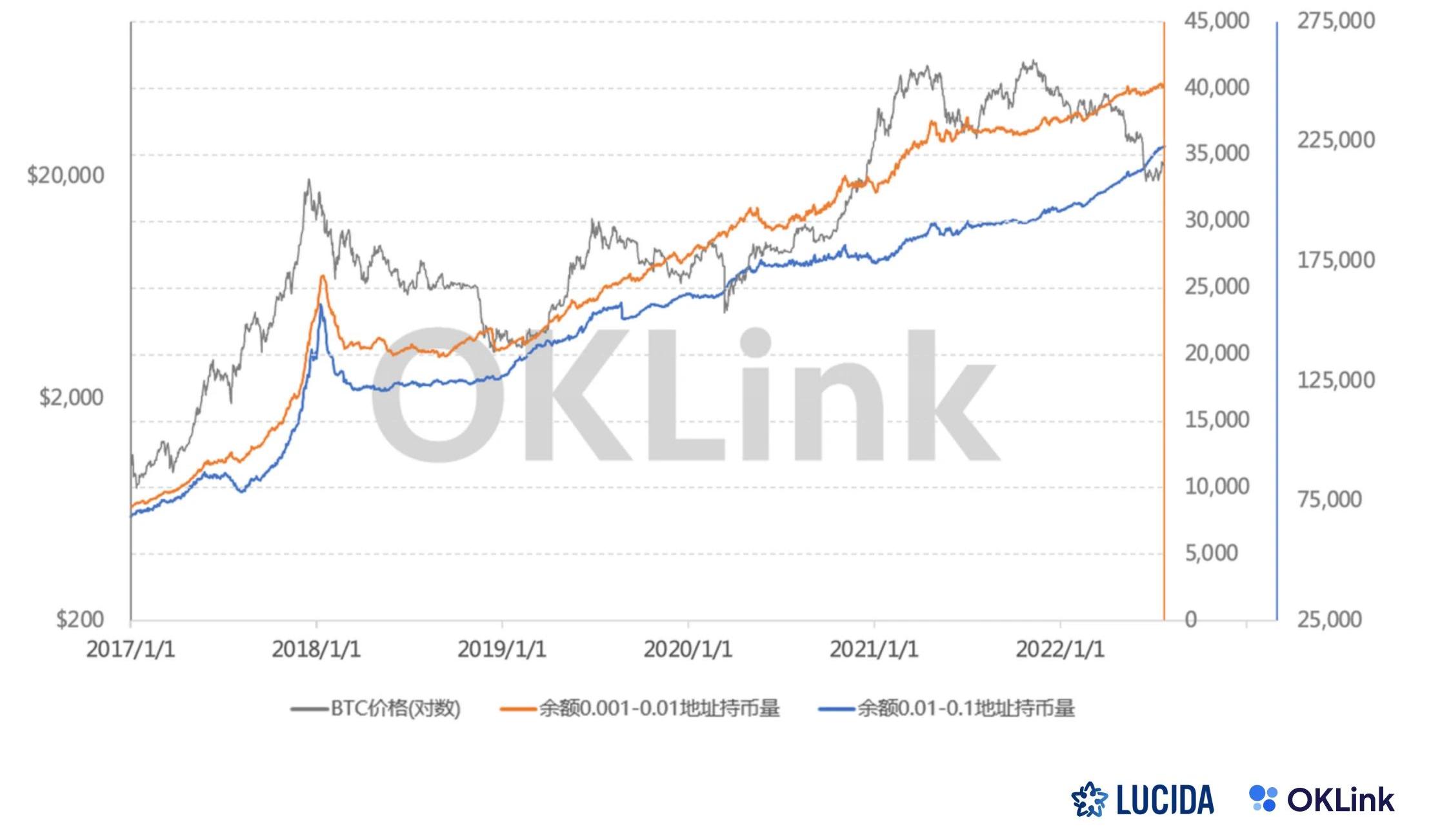 BTC200周均线,Tradingview数据而用上帝视角回溯,这几次触碰200周均线的点,几乎都是历史上的最佳买点。目前,200周均线,也就是1400日均线在22,705美元的位置。4)持币地址数,透露「阶级立场」根据不同地址持有的BTC余额,我们将holder简单分为:?散户?中产?巨鲸?超级巨鲸由于不同净值用户对市场的影响力不同,专业度不同,掌握的信息也就不同,对周期的敏感度也会不一样,进而对我们预判牛熊的参考意义也不同。散户散户持币数波动基本呈现跟随币价的规律,且减持落后于币价回落,参考意义不大。