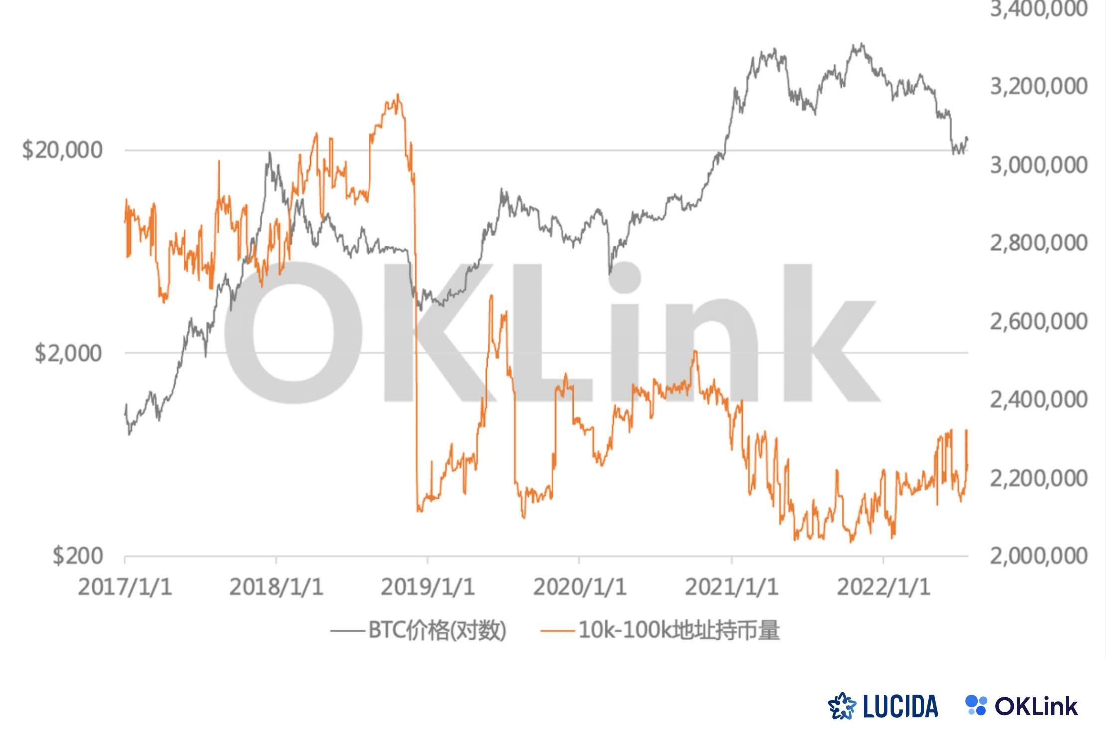 0.001-0.01BTC地址持币量vs0.01-0.1BTC地址持币量vsBTC价格中产在2018年BTC价格见顶前后的牛熊周期中我们可以看出,属于「中产」,即持有100-10kBTC的地址们在牛市顶峰前开始减持。但到了熊市底部,「中产」仍在继续减持,与BTC走势形成背离,可见对市场底部没有形成共识。2020年牛市开启后,「中产」也比较「后知后觉」,在2021年年底BTC价格触顶后对于市场后期的判断也没有领先性,基本与市场同频。总体来看,中产整体对周期的判断略强于散户,但对牛熊周期的判断参考意义不是很大。