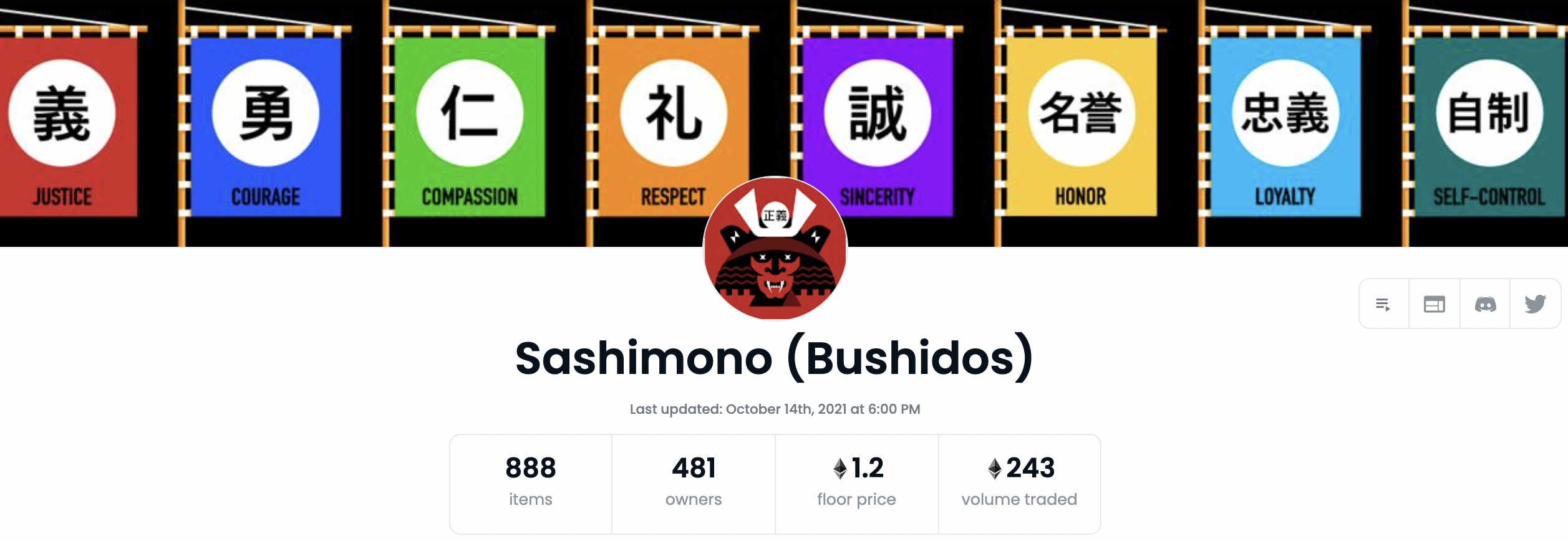 除了 Boshidos NFT 外,团队此前推出了 Sashimono NFT(武士旗帜)。一共有8种,总量888个代表不同道德原则的武士旗帜。包括:忠义、勇、诚、仁、礼、义、自制、名誉。