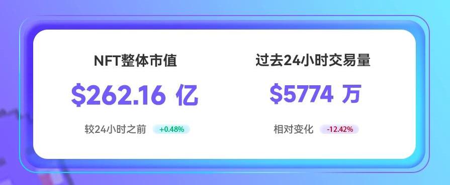 截至6月8日15时,NFT整体市值262.16亿美元,较24小时前增长0.48%;过去24小时内总交易量约5774万美元,日环比下降12.42%。