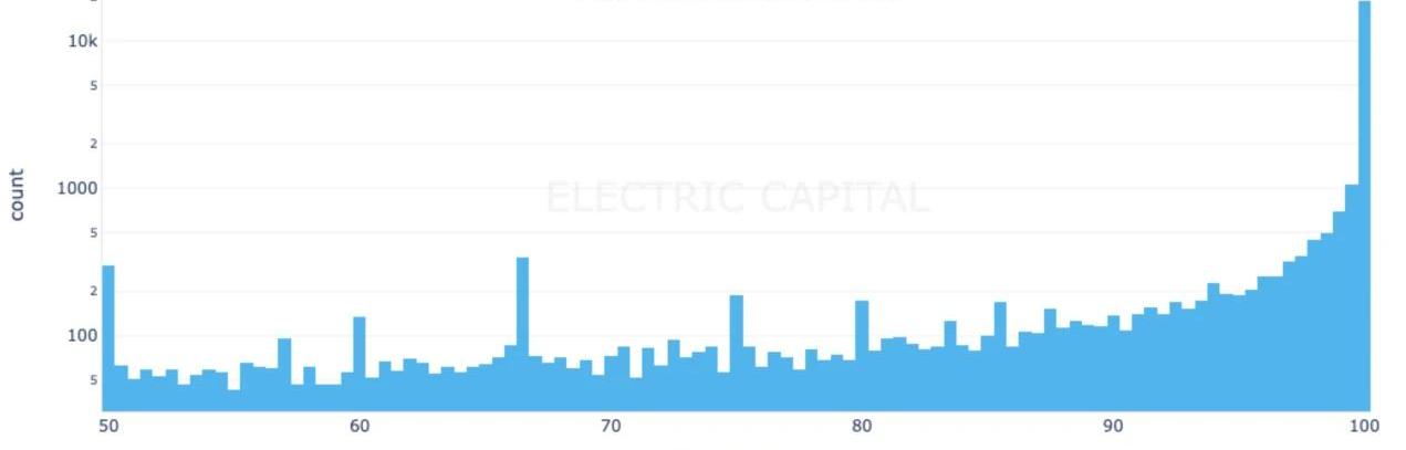 前段时间@optimismPBC直接移除了一个由@cobie提出的提案的行为引发了市场的激烈讨论。一个关键的问题在于DAO治理的去中心化程度究竟如何,如果这个组织实际上是中心化的,那么自然就违背了DAO成立之初的准则。我们可以用Ginicoef衡量一个DAO治理的去中心化程度究竟如何。Ginicoef是衡量收入平等的标准,也可以用于「评判」DAO,其中1指高度中心化,0指高度去中心化。举个简单的例子来说,如果一次治理投票中用户A有1张投票权,B有1张投票权,C有10张投票权。如果只有A参与了投票,则Ginicoef为1,如果A和B参与了投票,则Ginicoef为0。事实上大多数DAO提案的最终结果都严重偏向于少数强大的投票者,约有25%的提案的Ginicoef大于等于0.8。