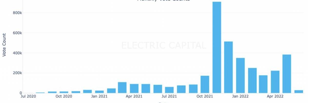 除了提案本身的数量快速增长以外,参与治理投票的人数也取得了大幅增长,在去年5月到今年5月的一年时间里,从44.8万人次增长到了370万人次,增幅达到8.3倍。虽然月投票数峰值相较去年11月有所下滑,但目前相比去年上半年,仍然保持了相当大的增长。