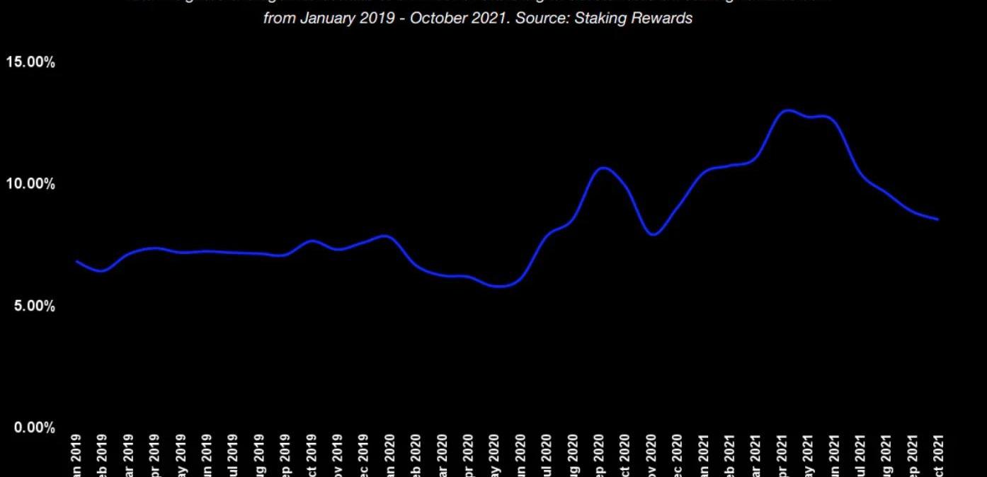 来源:2021年质押生态系统报告权益证明为用户提供了一种获得稳定收益的新方式。它将原生资产委托给质押节点,这样进行质押的用户就可以获得平均10%~20%的年化收益率。这种方式就像国家的国债一样,它是稳定的,低风险的,它比流行的DEX和借贷平台上的稳定币挖矿更有利可图。