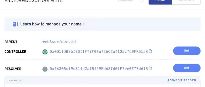 下面是使用ENS子域名管理你的多个钱包地址的一个示例设置:web3surfoor.eth→0x0011DB7bfB0f1F77F03a726C2a4135c759FF515Bvault.web3surfoor.eth→0x2f2E21B7E1248FdAc5e802435Ef5AFa48Fb1f8Feminting.web3surfoor.eth→0x8a4716f66e7D204BE0d0223D6Dba91Dd23b4F7f7其中“web3surfoor.eth”可以替换为你的ENS域名。在这里我不详细介绍如何设置ENS子域名,但Bankless有篇文章中有一段中有关于如何设置它们的指南。