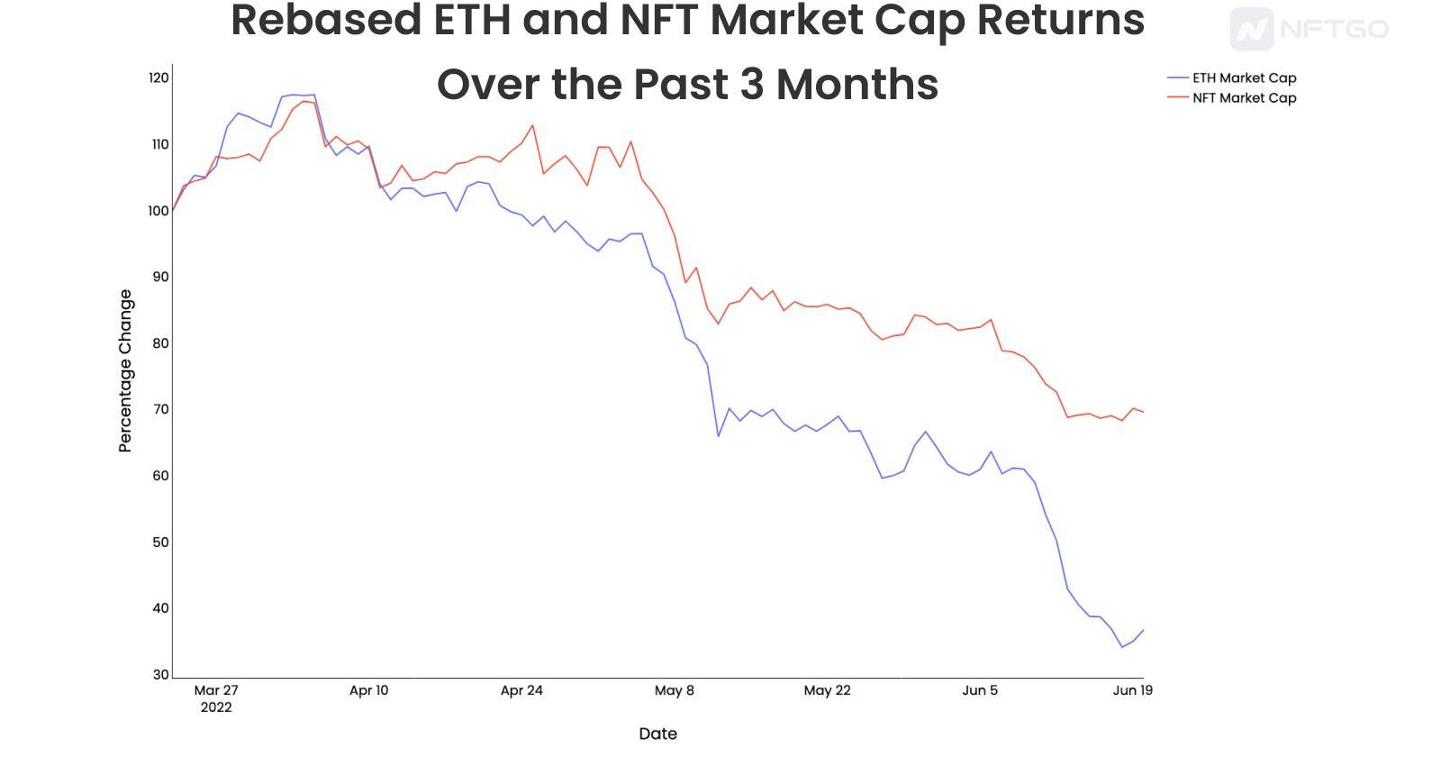 过去3个月的重定ETH和NFT市值回报率图表中另一个有趣的数据点是,在当前的熊市周期中,NFT市场与ETH相比具有很强的弹性。虽然ETH从最初的市值下降了50%以上,但NFT市场只下降了30%。为什么NFT的崩溃程度低于ETH?