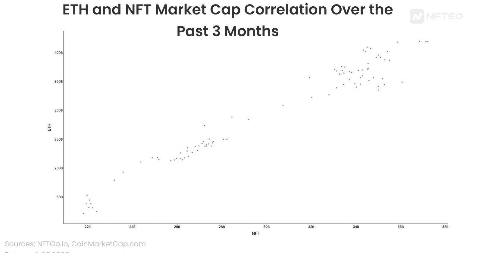 不同关联度的散点图的结果散点图也可以显示两个数值之间的相关强度,上述图表都是理论上的完全正相关、负相关或零相关的情况。然而在现实世界中,这些关联性可能会更弱,甚至显示出盘整。这些关联性的强度取决于市场的周期。下面的图表说明了在过去3个月中NFT和ETH市值之间的相关性。X轴代表NFT的总市值,在其高峰期增长到超过380亿美元,y轴表示同一时期3个月内的以太坊市值。