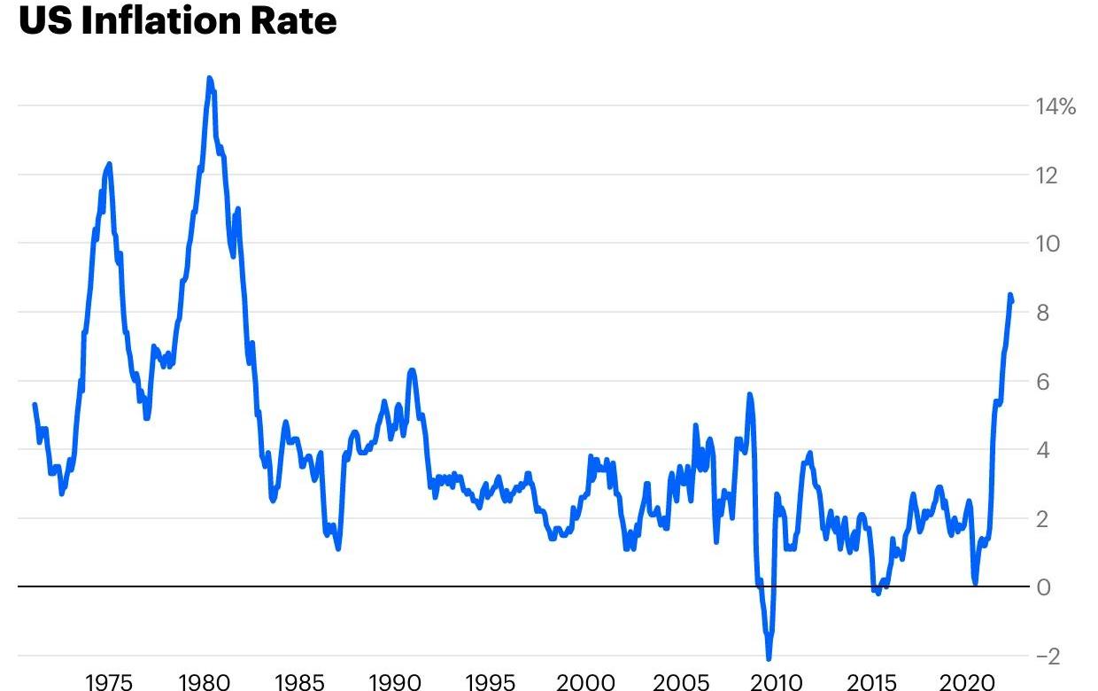 当金融体系充斥着资金,资产不断上升时,每个人都觉得自己更富有了。人们可以花更多的钱,公司可以支付给他们的员工更多的钱。当消费和收入增长快于商品生产时,就会出现“钱多,而购买的商品少”,商品价格就会上涨。由于疫情的封锁,供应链受到冲击,整个经济中的商品更加稀少。有更多的钱,而更少商品被购买,导致更严重的通货膨胀。这种情况在2021年5月开始显现。消费者价格指数衡量的是消费者在天然气、公用事业和食品等商品上支付的价格变化。从2021年3月到5月,它从健康的2.6%指数飙升至5%。到2022年3月,通胀率达到了40多年来从未见过的8%。