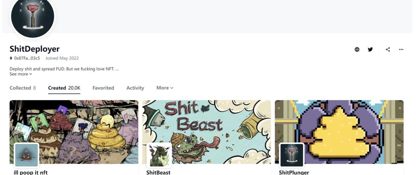 熊市到了现在,市场突然涌现出一批以「丑、恶、怪」为特点的NFT,这样一股「泥石流」的冲击,不禁让人们怀疑NFT的价值到底与何种共识对应,也许是因为人们对于目前市场的不满,大部分NFT都处于亏损的状态,这时poopNFT对一些NFT的讽刺正好引起了人们共鸣,存在着一部分情绪上的共识。随着ShitDeployer不停地升级玩法,屠龙少年是否也会成为恶龙呢?让我们持续观察。