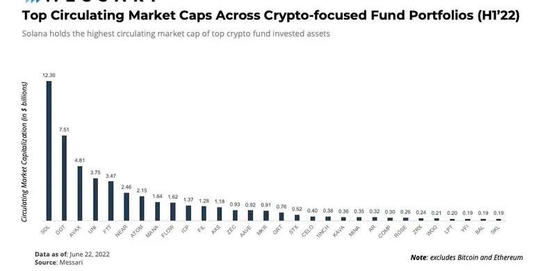 第二个最广泛持有的资产是OasisNetwork。排名第三的是前五名中的新人NervosNetwork,排名飙升12位。通过主要协议更新以及互操作性和隐私功能的进展,Nervos在2022年制定了有力的目标。值得注意的是,前三名都是智能合约平台,这表明该行业在加密领域继续占据主导地位。并列第四受欢迎的资产是dYdX(DYDX)和Radicle(RAD)。Radicle在上次报告中排名20名开外,此次其排名大幅跃升。dYdX是上半年最受欢迎的DeFi项目之一,而Radicle是数据管理领域最受欢迎的资产。第五受欢迎的资产是新兴的智能合约平台NEARProtocol,排名从第三位下降至第五位。在上次的分析中,Terra是第四大最受欢迎的资产。根据我们的分析,Terra在技术上是第12大最受欢迎的资产,但由于大多数投资于Terra的资金在资产崩盘期间退出,因此将其排除在分析之外。此外,在此前的分析中,Terra还拥有最高的流通市值。显然,今时已不同往日。在前30大投资资产中,流通市值最高的现在属于Solana。在上次的分析中,Solana的市值排名第二,仅次于Terra。Solana作为智能合约领域领导者的角色是显而易见的,因为它的市值几乎是其中第二名Polkadot的两倍。SKALENetwork(SKL)拥有前30名资产中流通市值最低的资产,而FTXToken(FTT)拥有前五名资产中流通市值最低的资产。Avalanche自第四季度以来已跌破Polkadot,而Uniswap(UNI)和FTT均已超过Cosmos和NEAR。此外,与上次分析相比,由于近期价格波动,大多数资产的市值至少下降了50%。