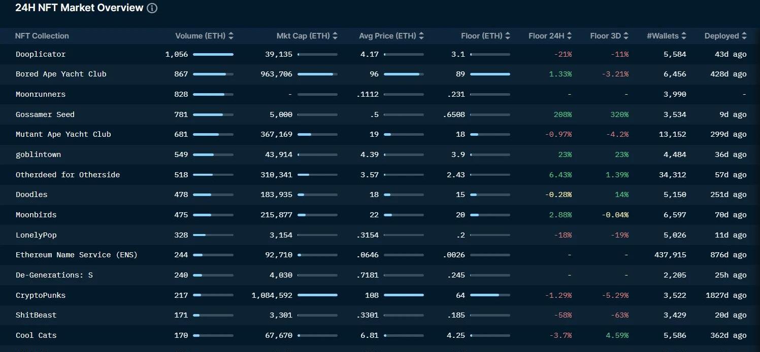 本周NFT市场自5月1日下跌以来,出现了单周最大反弹,整体NFT市场价值上涨超15%,但整体交易量并未出现明显上升,本周值得关注的项目是Dooplicator,其为Doodles团队的二期项目,目前仍是盲盒状态,当前地板价约为3个ETH,对比Doodles的14个ETH的地板价,仍有较大增长空间。