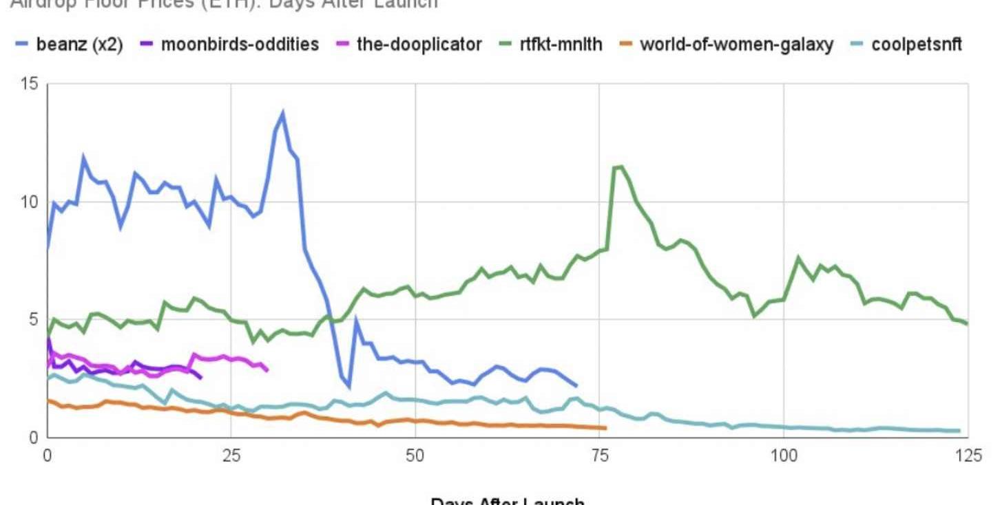 NFT是动量资产,如果昨天地板价上涨,今天就有更大几率上涨。不过,NFT地板价大多数时候都将下跌。