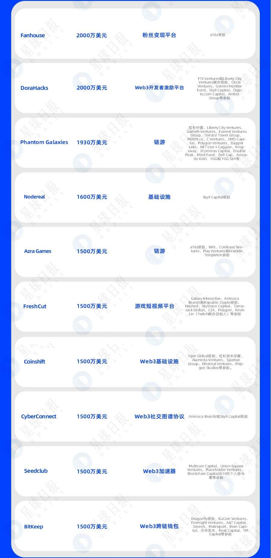 以下为具体融资事件:加密初创公司KaJLabs完成4亿美元融资,GEMDigital领投加密初创公司KaJLabs通过LITHO代币销售完成4亿美元融资,创下2022年迄今全球规模第二大的种子轮融资。GlobalEmergingMarketsDigital领投、FourDigital等参投。据悉,GEMDigital是管理资产规模达50亿美元的另类投资集团,总部位于巴哈马。KaJLabs旗下区块链平台Lithosphere利用嵌入式深度神经网络使智能合约变得智能的区块链,而且支持跨链网络运作,这种互操作性在单一管理结构下实现多种价值转移方式,从而消除现有区块链网络中固有的许多问题。*东南亚数字支付公司Xendit完成3亿美元D轮融资,Coatue和InsightPartners共同领投东南亚数字支付公司Xendit宣完成3亿美元D轮融资,Coatue和InsightPartners共同领投,Accel、TigerGlobal、KleinerPerkins、EVGrowth、Amasia、Intudo和GoatCapital等投资机构和投资人参投。部分资金将用于扩展泰国、马来西亚和越南等新市场。在本轮融资之前,Xendit已于2021年9月完成由TigerGlobalManagement领投的C轮融资。据悉,Xendit成立于2016年,目前拥有3000余名客户。其年化交易比去年增加了两倍,从6500万增加至2亿。交易总价值也从65亿美元跃升至150亿美元。其客户包括Traveloka、Transferwise和Grab。VoyagerDigital通过私募配售融资6000万美元,AlamedaResearch领投加密资产经纪商VoyagerDigital通过私募配售融资6000万美元,AlamedaResearch领投,GalaxyDigital、Blockdaemon以及DigitalCurrencyGroup等参投。VoyagerDigital表示,当发行完成后,该公司将拥有超过2.25亿美元的流动性,包括约1.75亿美元的现金和另外5000万美元的加密货币。另外,截至2022年3月31日,VoyagerDigital一季度营收为1.027亿美元,同比增长70%。链游公司N3tworkStudios完成4600万美元融资,GriffinGamingPartners领投链游初创公司N3tworkStudios宣布完成4600万美元A轮融资,GriffinGamingPartners领投,KleinerPerkins、GalaxyInteractive、KIP、Floodgate等参投。据悉,融资资金将用于开发团队目前的两款区块链游戏,其中Legendary:HeroesUnchained将于今年晚些时候推出。Certora完成3600万美元B轮融资,JumpCrypto领投星球日报讯为区块链智能合约提供安全分析工具的以色列公司Certora完成3600万美元B轮融资,JumpCrypto领投,TigerGlobal、GalaxyDigital、ElectricCapital、ACapital、FrameworkVentures、Coinfund、Lemniscap、Coinbase、VMware等参投。隐私计算网络Oasis获3500万美元追加投资,生态系统发展基金总额达2.35亿美元星球日报讯据官方消息,隐私计算网络Oasis宣布获得NewmanCapital、SevenXVentures等投资机构的3500万美元追加投资,生态系统发展基金总额累计至2.35亿美元。此前,在AMECloudVentures、FBG、PanteraCapital、DragonflyCapital、BinanceLabs等生态合作伙伴的支持下,Oasis成立2亿美元的生态系统发展基金,旨在扶持Oasis生态DeFi、数据DAO、NFT、元宇宙等领域项目发展,促进Oasis生态繁荣。获得3500万美元追加投资后,Oasis生态系统发展基金成为行业规模最大、实力最强的生态基金之一。加密钱包服务提供商Coins.ph完成3000万美元C轮融资,CRibbitCapital领投加密钱包服务提供商Coins.ph宣布完成3000万美元C轮融资,CRibbitCapital领投,若干未公开战略投资者参投。DeFi协议iZUMiFinance融资3000万美元,IvyVenture、Cobo等参投星球日报讯多链DeFi协议iZUMiFinance宣布完成3000万美元融资,包括来自IvyVenture、Cobo和Mirana等机构投资者,其中超过1000万美元来自与SolvProtocol合作的可转债融资。与此同时,iZUMi还宣布推出在BNBChain上的创新型DEX——iZiSwap,该DEX首创了新型离散流动性DL-AMM协议,具有超过传统的恒定乘积AMM数千倍资本效率的特点,为交易者提供更好深度,为LP提供更多回报,目前iZiSwap拥有1300万美金TVL,24小时交易量超过100万美金。Web3互动媒体公司Metatheory完成2400万美元融资,a16z领投,FTXVentures等参投Web3互动媒体公司Metatheory完成2400万美元A轮融资,a16z领投,PanteraCapital、FTXVentures、BreyerCapital、MeritCircle、RechargeThemeVentures、DragonflyCapitalPartners、Daedalus、Sfermion和GlobalCoinResearch等参投。据介绍,Metatheory由Twitch联合创始人KevinLin创立,旨在构建Web3游戏和虚拟世界,重点关注建立具有超越游戏本身的强大IP的特许经营权。加密交易所Gopax运营商Streami以2.92亿美元估值完成约2368万美元B轮融资,软银、DCG等参投韩国加密交易所Gopax运营商Streami以3700亿韩元估值完成300亿韩元B轮融资,软银与LINE的合资公司ZHoldings旗下风投子公司ZVC、KBInvestment、灰度母公司DCG、StrongVentures等参投。据悉,DCG于去年5月成为Gopax的第二大股东。粉丝变现平台Fanhouse完成2000万美元A轮融资,a16z领投粉丝变现平台Fanhouse近日宣布完成2000万美元A轮融资,a16z领投。Fanhouse联合创始人RosieNguyen表示,目前Fanhouse平台上的创作者总收入已经接近1000万美元。平台上的头部创作者包括乐队组合TheChainsmokers、象棋KOLAndreaBotez以及演员YoshiSudarso等。DoraHacks完成2000万美元B1轮融资,Dora核心基础设施总融资规模突破5000万美元星球日报讯去中心化全球极客组织和Web3开源开发者激励平台DoraHacks完成2000万美元B1轮融资,FTXVentures和LibertyCityVentures联合领投,CircleVentures、GeminiFrontierFund、Sky9Capital、Crypto.comCapital、AmberGroup等参投。本轮融资后,Dora生态核心基础设施总融资规模超过5000万美元。AnimocaBrands旗下链游PhantomGalaxies融资1930万美元AnimocaBrands和其子公司BlowfishStudios宣布其AAA级机甲格斗链游PhantomGalaxies完成1930万美元行星NFT私募融资,共售出7734颗行星和小行星NFT。战略支持者包括红