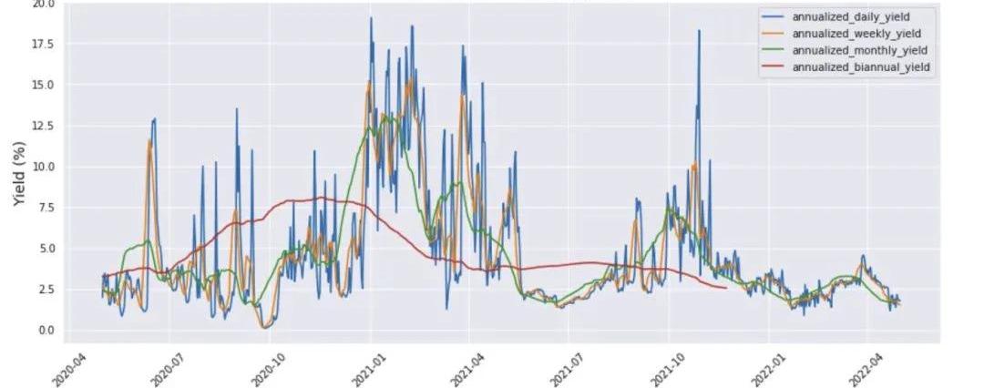 已将资产放入流动性池的Compound用户可以使用exchangeRate计算总借贷收益率,这表明贷方随着时间的推移可以获得的利息价值,从时间T1到T2可获得:R(T1,T2)=exchangeRate(T2)/exchangeRate(T1)-1此外,这种类型的抵押贷款的年化收益率(假设连续复利)可以计算为:Y(T1,T2)=log(exchangeRate(T2))—log(exchangeRate(T1))/(T2-T1)虽然Compound流动性池支持USDT、USDC、DAI、FEI等多种稳定币资产,但这里我们只分析前两种稳定币,即USDT和USDC,它们的市值分别为800亿美元和530亿美元。它们合计占据了稳定币总市场的70%以上。下面是根据上一节的公式计算出的年化日、周、月和半年收益率的图。日收益率有些波动,而周收益率、月收益率和半年收益率分别是之前图的平滑版本。USDT和USDC在图中有相对类似的模式,因为它们在2021年初都经历了高收益率和高波动性。这表明,有一些系统性的因素正在影响整个稳定的借贷市场。