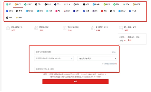 2、比如选择“BTC”进行杠杆理财,填写“理财数额”、“放款天数”以及“资金密码”,再点击“确定”。