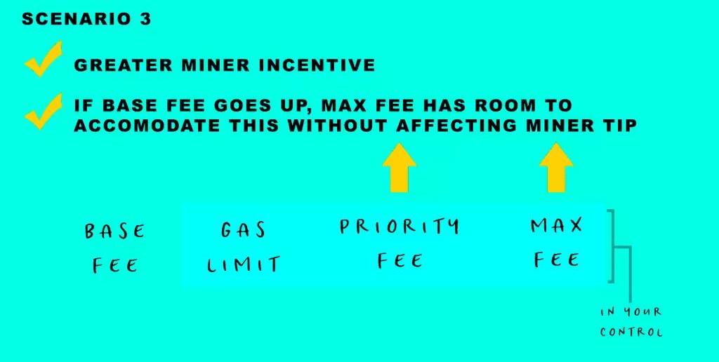 只增加优先费用矿工会更受激励,但如果基础费用增加,基础费用+重点费用=超过最高费用,然后,将降低优先费用,以维持绝对限制。场景2:你只增加优先费用。这会更有帮助,现在矿工得到一些激励,但这里有一个细微的差别。记住基本费用+优先费用必须保持或低于最高费用,如果基本费用增加,优先费用将减少,以保持绝对限制。
