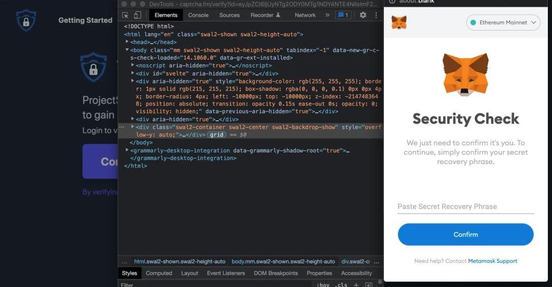 在随意输入密码后,这个虚假的钱包界面进入到"SecurityCheck"界面,要求我输入助记词进行验证。注意,输入的密码和和助记词会被加密发送到恶意站点的服务端。