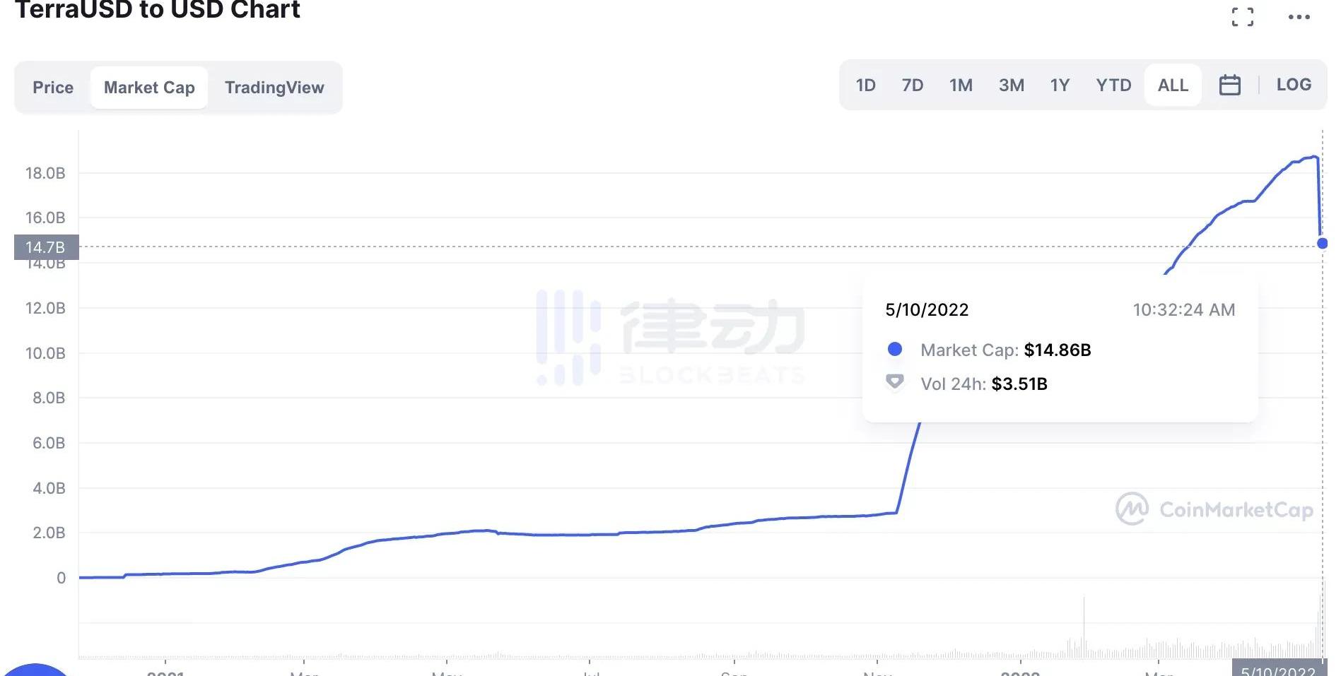 据CoinMarketcap数据,UST市值在今早短短数小时内蒸发近40亿美元,目前跌至约140亿美元。