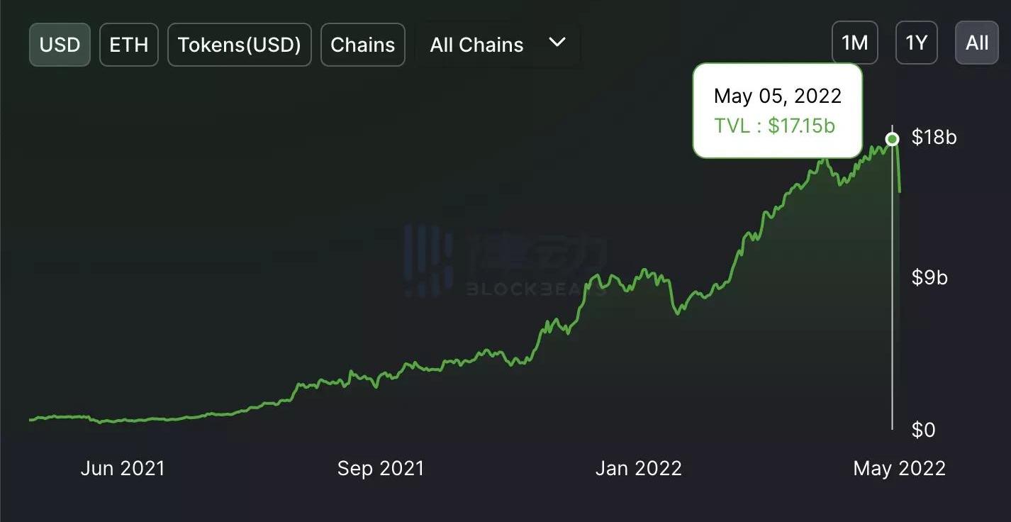 读到这里你可能会好奇,UST市值不是有170亿么?怎么这种小级别的抛售就对锚定造成威胁了?没错,UST是当前最大的算法稳定币,理论上来说应该是有抵抗强抛压的能力。但与UST还有一个强关联的协议:AnchorProtocol。果然,一查吓一跳。截止5月5日,AnchorTVL上升至180亿美元,几乎占据了UST的所有市值。换句话说,市场上几乎所有的UST都存在了Anchor里赚20%的APY!